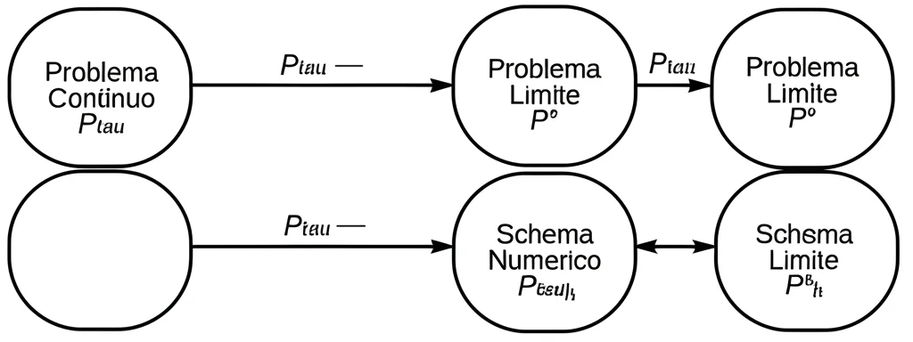 P^0 (limite tau->0), P^tau -> P^tau_h (discretizzazione), P^0 -> P^0_h (discretizzazione), e la freccia cruciale P^tau_h -> P^0_h (limite tau->0, proprietà AP). Grafica informativa, stile pulito, frecce chiare. Fotografia concettuale, alta definizione.” />