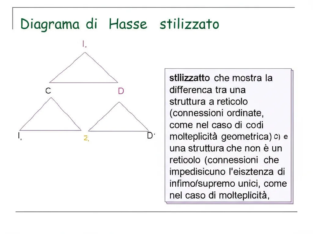 - Se qualche autovalore ha due blocchi di Jordan (molteplicità geometrica 2), ([O, B]) è ancora un reticolo, ma la sua struttura è più complessa (non è più distributivo, contiene delle sotto-strutture particolari).